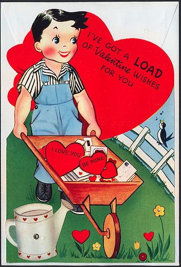 Vintage 9" tall diecut mechanical valentine with a boy carrying a wheelbarrow full of valentines. The sprinkling can swivels on a brass grommet. Nice condition. The picture is set against the original envelope which is included. From a long closed factory that made them in the 1950s. Very colorful. These days it will cost you $5 to buy a new good quality oversize card with the envelope like this. These are a real bargain.